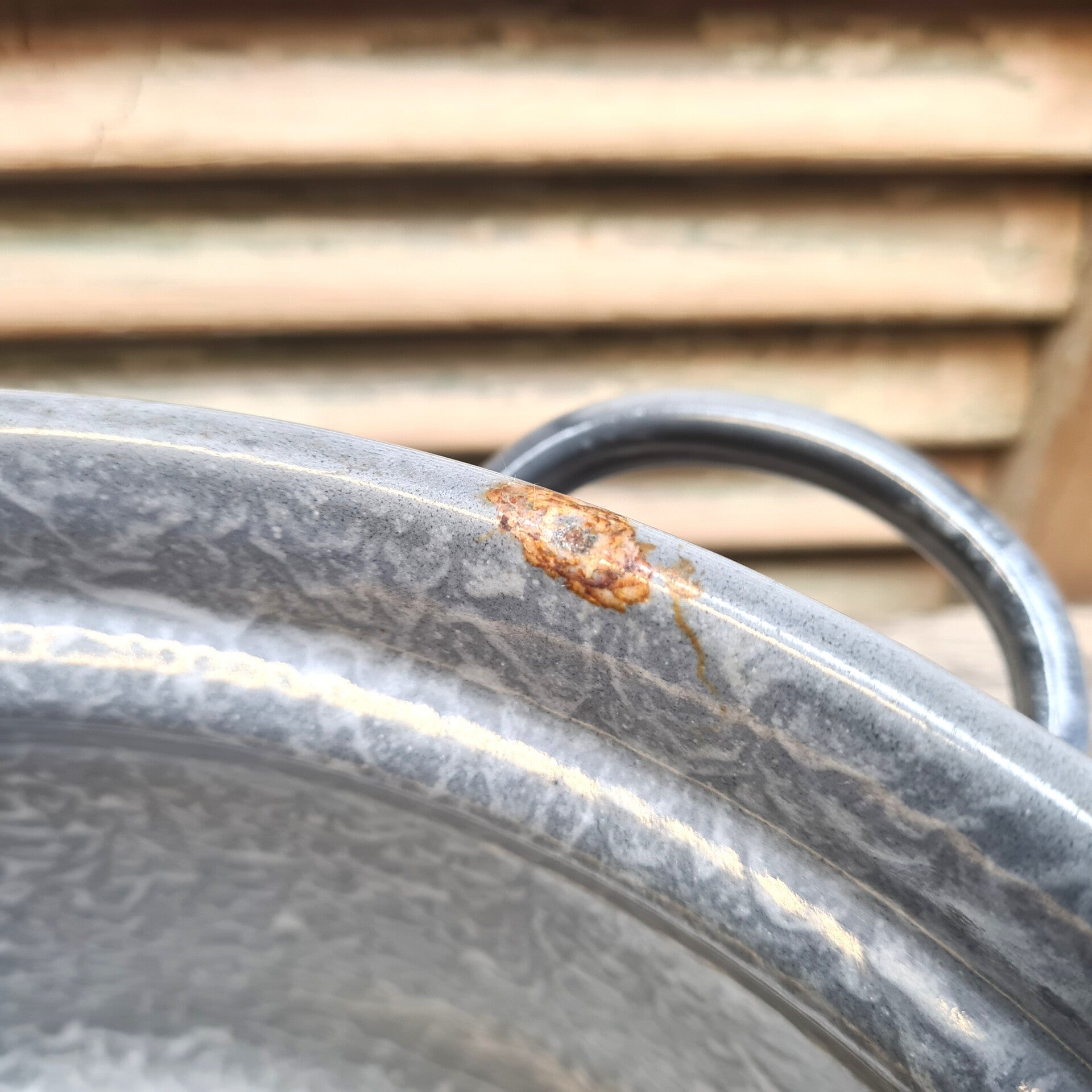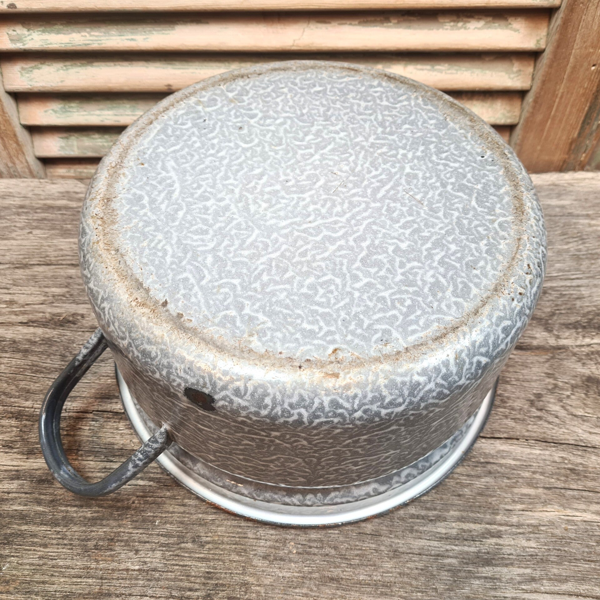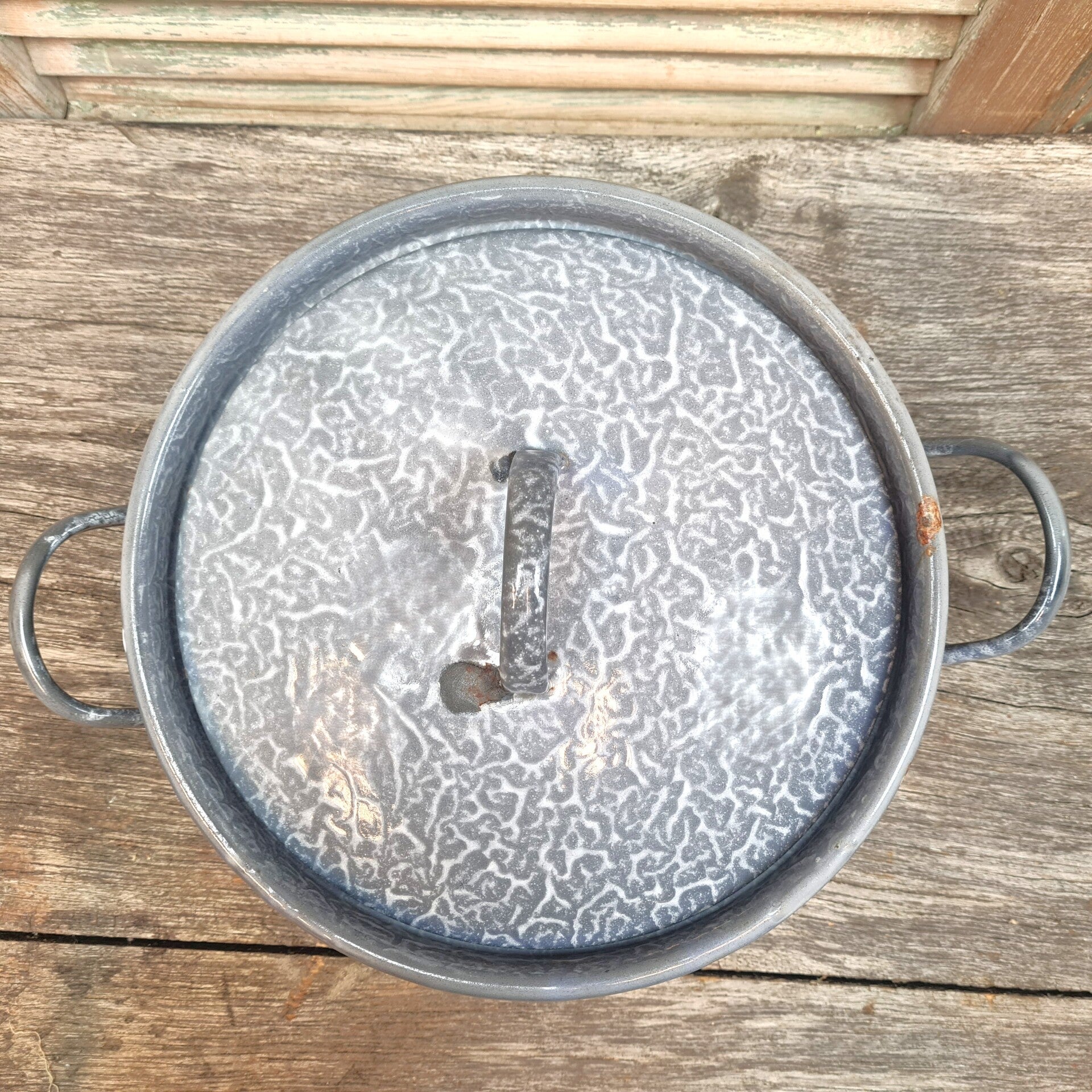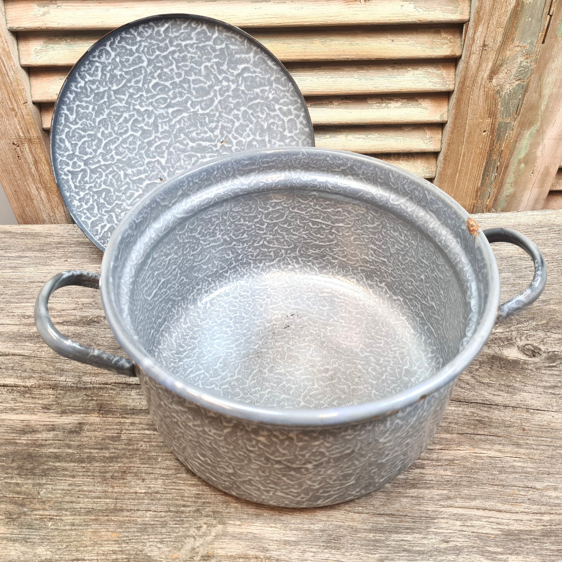 Deze pan van grijsgewolkt emaille met deksel uit grootmoederstijd is leuk om mee te decoreren. Leuk voor de verzamelaar en brocante liefhebber.